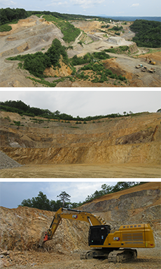 鉱区の周辺は標高250m内外の丘隆性台地で準平原をなしており、露天掘りに適しています。 地質は古生代のチャート、粘板岩、石灰石、輝緑岩等が走向、北北西〜南南東、傾斜60〜70°で累層し、第4紀洪積層がこれらを覆っています。 珪石鉱床はこのチャート層であり、現在の稼行範囲は東西方向に200〜300m、南北方向で700mです。広域熱変成を受け、珪石の石英結晶が20〜70μmに揃っています。 鉱質は中央部が SiO2 96%以上、 Al2O3 1%以下、上盤、下盤側共 SiO2 93%以上、 Al2O3 2%以下です。また、鉱床は地殻変動の応力を受けており、亀裂が発達しているため破砕し易くなっております。 |
