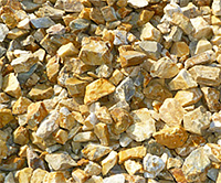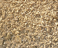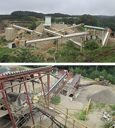 採掘方法はベンチカット方式による露天採掘で、表土を除いた後、発破、油圧ブレーカー、パワーショベルを使用して月産約8,000〜9,000tを採掘しております。 選鉱工程では、採掘原鉱をダンプトラックで選鉱受入ビンに投入し、#1ジョークラッシャーで大塊を粗砕した後、#1振動篩で篩い分けを行い、 その+30mmを#2ジョークラッシャー、コーンクラッシャーで中砕し、更に#2振動篩で篩い分けを行い、セメント用(30-0mm)を生産しています。また、鉄鋼(30-10mm)も生産しています。 |