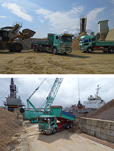 製品大半は山元からダンプトラックで運搬距離約12kmの久慈港ストックヤードまで輸送し、1,500t〜2,000t級の船舶で海上輸送を行っております。 尚、久慈港は、1,500t級の船舶が接岸可能です。 ダンプトラックによる陸送の場合は、山元からユーザーへ直接出荷しております。 |